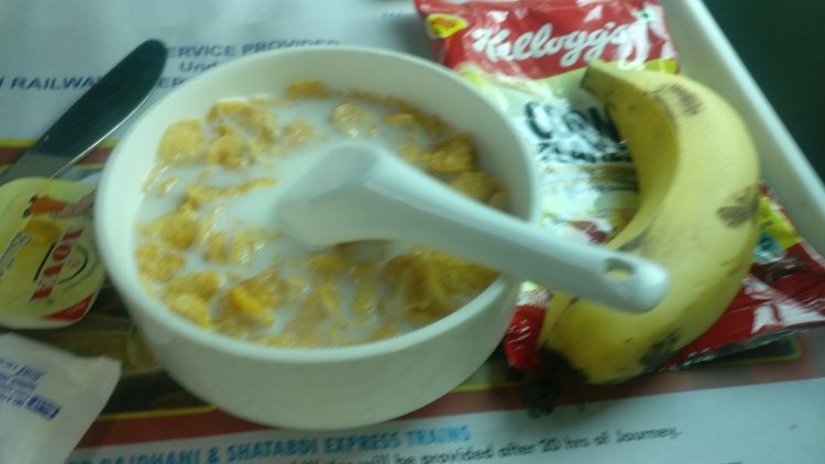 I occupied my seat, found it more comfortable than the other classes. Leg-space was more, seats were stylishly cushioned and covered. Satisfied with the ambience, all I wanted was to be served with good food.Quickly and sharply, stewards brought water bottles, a cold beverage and hot tea with Marie biscuits. Sipping tea in the first class AC compartment, I went through the fresh newspaper that was placed on the chair before our arrival.My newspaper coverage was interrupted midway by the service boy.”Do you want cornflakes?”Thinking “This seems to be the ‘Executive Class addition”, I replied, “Yes, please”.A bowl and a packet of cornflakes were placed in a tray. The guy poured some milk in the bowl and I was ready to feast. Another surprise, a banana, also accompanied the pre-breakfast treat. The journey was five and a half hours long and two hours were already over. I began to look into my mailbox on my phone and scrolled through the social media posts while waiting for another round of breakfast;)